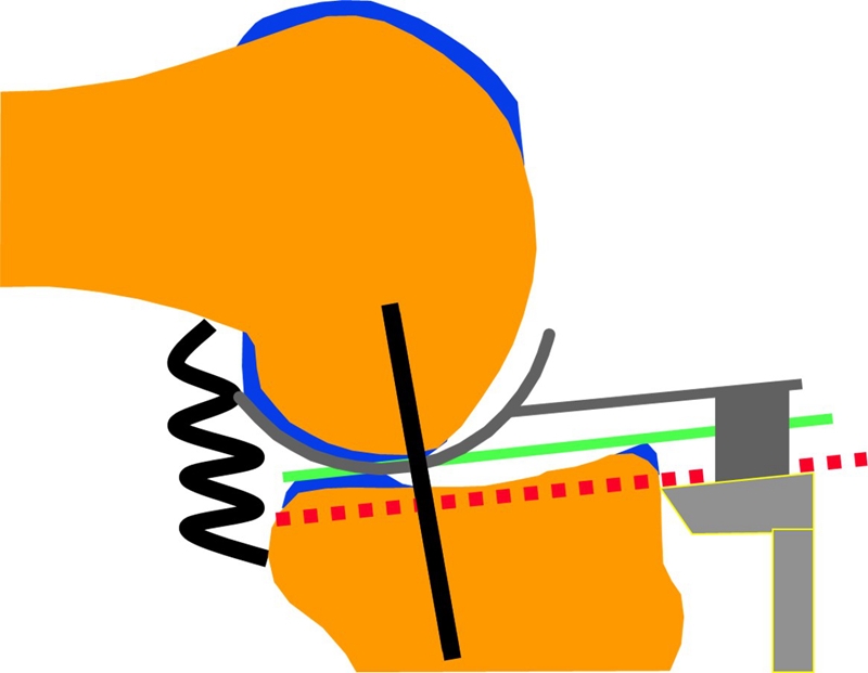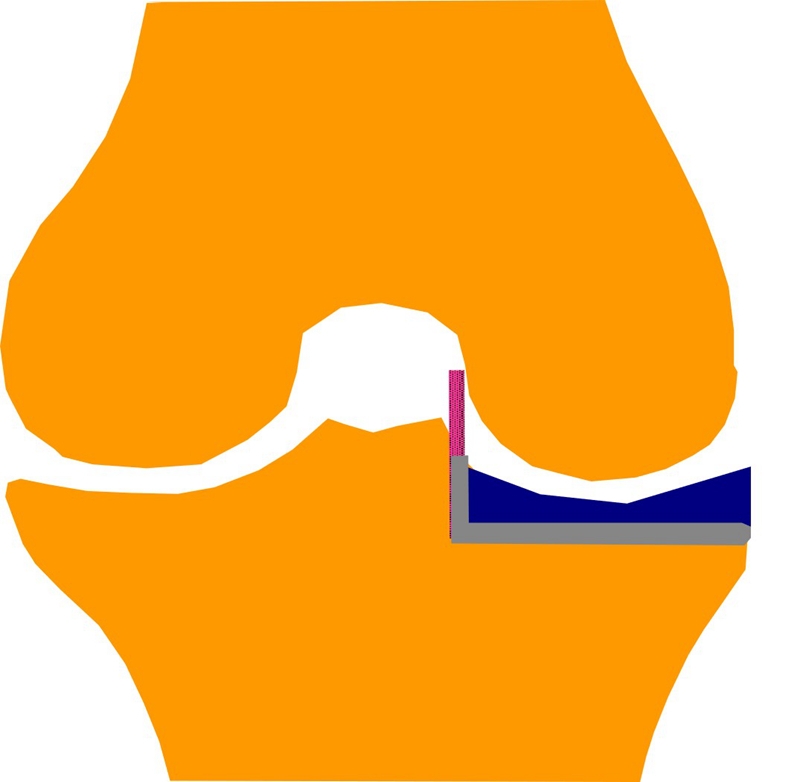 理想的垫片放置于距离外侧1mm,过远易发生垫片旋转脱位,过近易发生撞击。确保垫片不要撞击侧壁,不然—再次截骨。