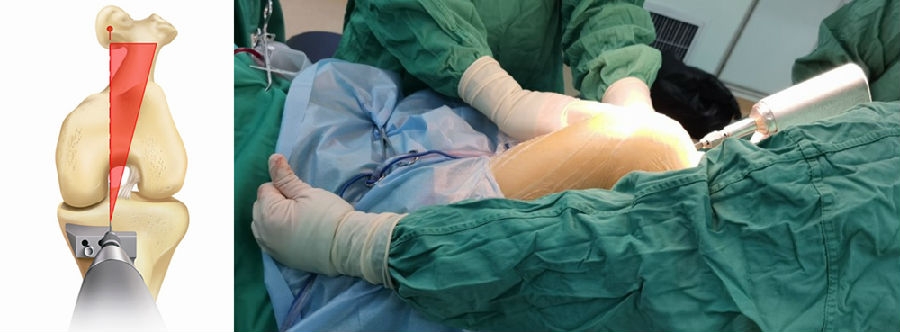垂直截骨内外定位:垂直截骨位置位于内侧棘顶端的内侧,在股骨髁外侧2到3mm处,紧贴ACL足印区内侧。