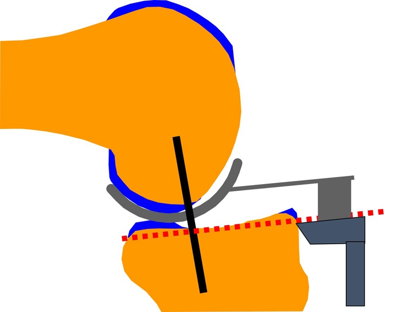 胫骨水平截骨深度:根据胫骨假体整体厚度决定,尽量少切胫骨,MCL松弛时减少切骨量。张力是绷紧MCL即可。