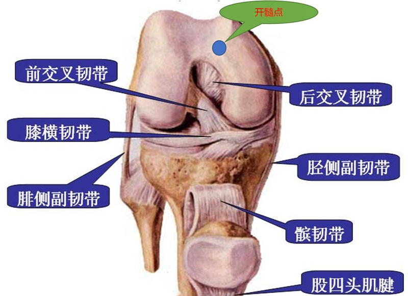 骨赘:清理内侧股骨髁,、髁间,,胫骨前方骨赘(尤其髁间顶部、ACL附近)。切勿清理胫骨内侧骨赘。