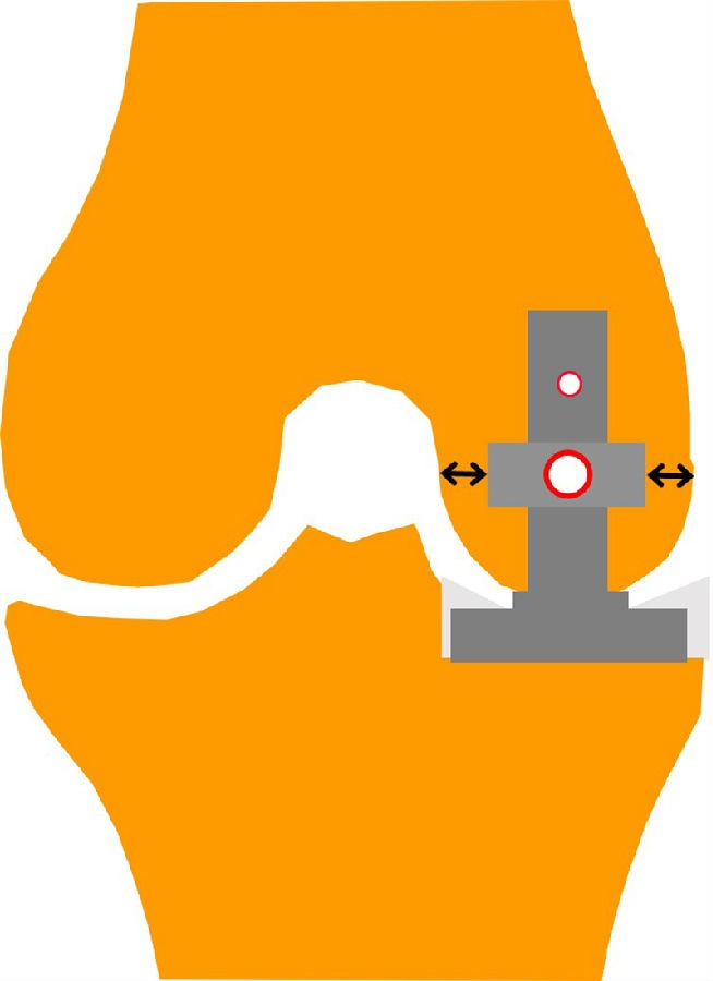 股骨钻孔方法:插入髓内杆,插入导向器并设置为G型夹所选厚度,插入连接器以确保10°屈曲,保证6mm孔(股骨柱)在股骨髁正中间,避免前内侧悬出,注意导向器的外侧移动。钻孔的位置直接决定假体的位置。