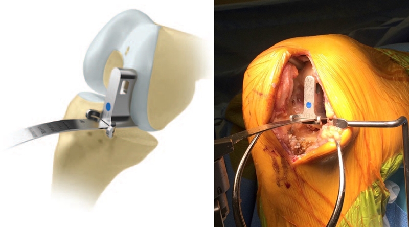 ③紧贴股骨后髁的勺状测量器可指导胫骨截骨 。