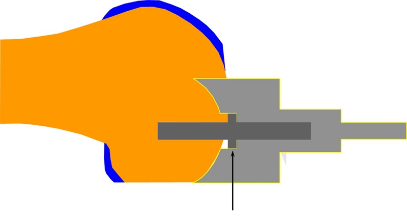 股骨远端截骨,插入研磨杆,采用0号研磨杆进行基础研磨,领部的厚度不同提示研磨的深度不同