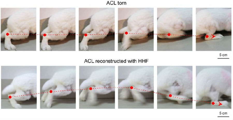 图1 使用新型的取向碳纳米管纤维材料进行ACL重建后的兔子可以正常跳跃