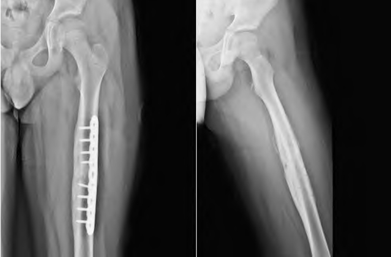 2.钢板内固定:既往对于大体重的儿童、累及股骨近端或远端的儿童复杂骨折,弹性髓内钉固定较困难,失败率和畸形率高,所以多选择钢板螺钉固定,但是钢板内固定有其明确的适应证。另外,由于术中切口较大,局部创伤大,对骨折端的骨膜剥离大进而对局部血运产生影响,出现骨折不愈合或延迟愈合等情况。此外,钢板内固定为偏心性固定,骨折线处的高扭转应力并不利于稳定固定,易发生钢板疲劳、断裂、取出困难等情况。由于存在应力遮挡存在取出后出现再骨折的现象,采用钢板螺钉内固定治疗儿童股骨干骨折呈现减少的趋势。