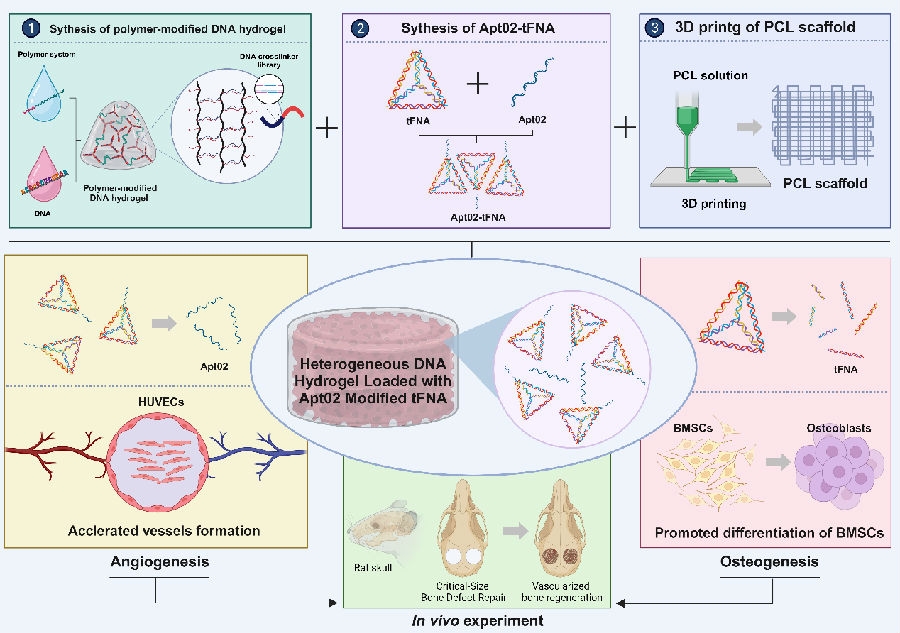 Han Y, Wu Y, Wang F, Li G, Wang J, Wu X, Deng A, Ren X, Wang X, Gao J, Shi Z, Bai L, Su J. Heterogeneous DNA hydrogel loaded with Apt02 modified tetrahedral framework nucleic acid accelerated critical-size bone defect repair. Bioact Mater. 2024 Jan 18;35:1-16. doi: 10.1016/j.bioactmat.2024.01.009.