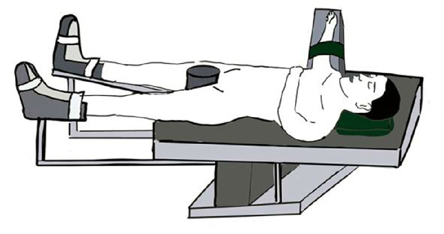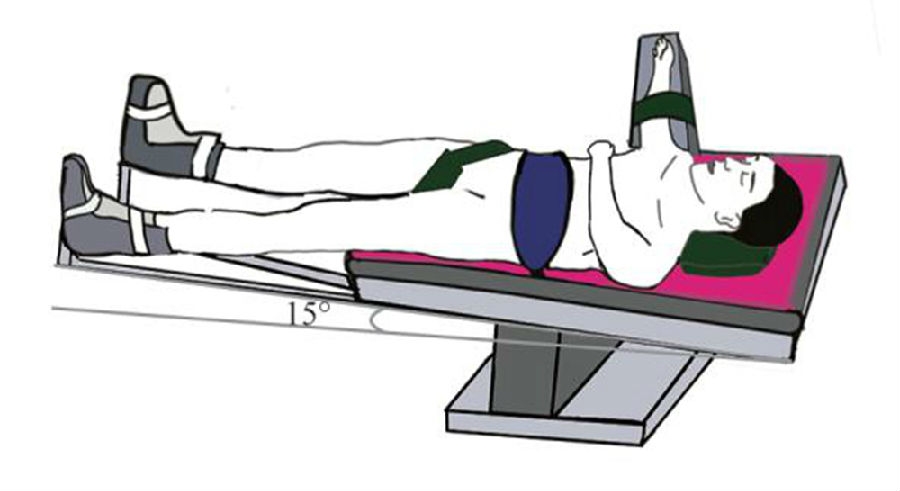 采用全身麻醉,并使用肌松剂来增强牵引效果。患者仰卧于手术床上,对侧上肢固定在外展架上,患侧上肢悬吊固定在胸前支架上。患者的躯干与手术床巾单接触,臀部置于床的末端(图5)。将双侧足、踝骨突起处包裹棉垫,置于牵引靴内,对侧下肢固定于外展45°,患侧下肢伸直、内旋15°。用加厚棉垫包裹的束缚带将患者对侧腹股沟固定在手术床上,作为对抗牵引。腹部使用腹带,使患者背部贴近床面,增加摩擦阻力,保护患者不从手术床上摔下来(图6)。注意腹带不要固定太紧,以免压迫腹部。当前面的准备工作完成后,将手术床缓慢调整到Trendelenburg体位(Trendelenburg体位是指外科手术中患者采用头低脚高仰卧体位),患者的头低、脚高约10-15°(图7),利用重力产生的摩擦力,对抗下肢牵引力。