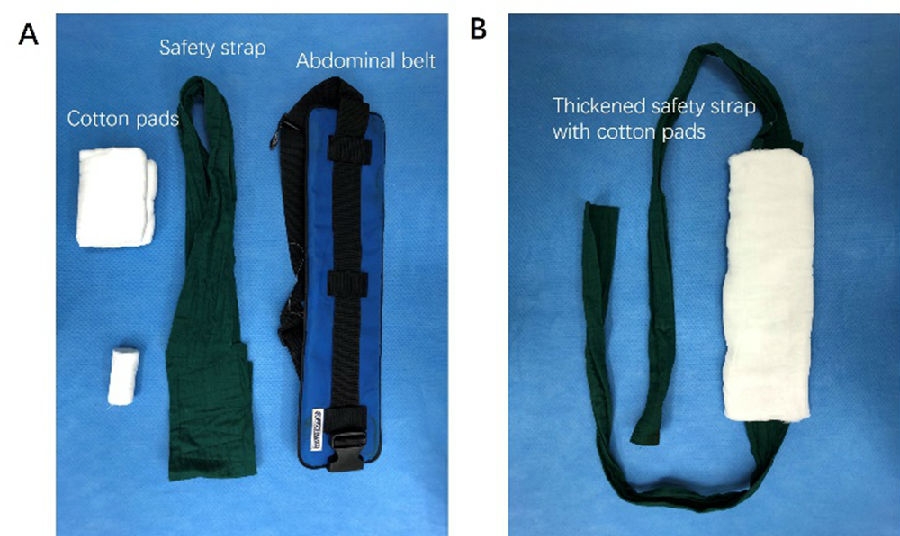 图3 A.术前准备束缚带和腹带;B.束缚带使用厚棉垫包裹