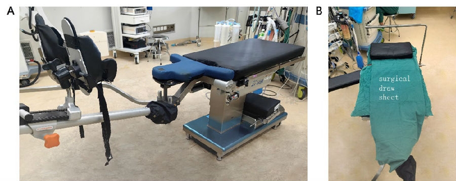 图4 A.骨科手术床,尾端连接髋关节牵引架;B.手术床铺手术巾单