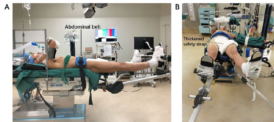 髋关节镜已成为治疗股骨髋臼撞击综合征(FAI)、盂唇损伤等髋关节疾病的主要手段,髋关节适当的牵引是手术成功的必要条件。传统的牵引方法使用会阴柱对抗牵引,但会阴部软组织损伤和神经损伤等并发症居高不下。为此解放军总医院骨科医学部运动医学科研发了一种无需额外器材设备辅助的无会阴柱牵引技术。该方法仅使用手术室中常规配备的手术床、束缚带和骨科牵引架,采用头低脚高体位,无需会阴柱辅助即可实现髋关节间隙的充分牵开。此方法操作简单可靠,可重复性好,已得到国际认可。