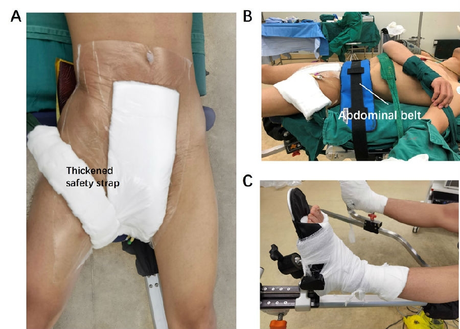 图6 A.健侧腹股沟束缚带固定;B.腹带固定躯干;C. 双侧足、踝骨突起处包裹棉垫,置于牵引靴内