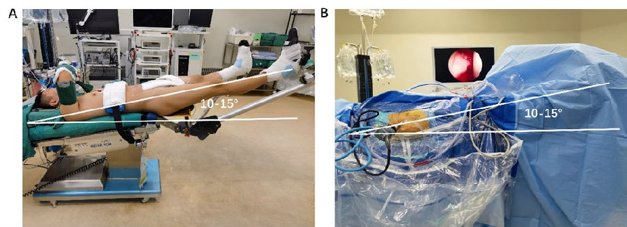 图7 患者Trendelenburg体位 A.手术床调至头低、脚高约10-15°位;B. 消毒铺巾后患者体位