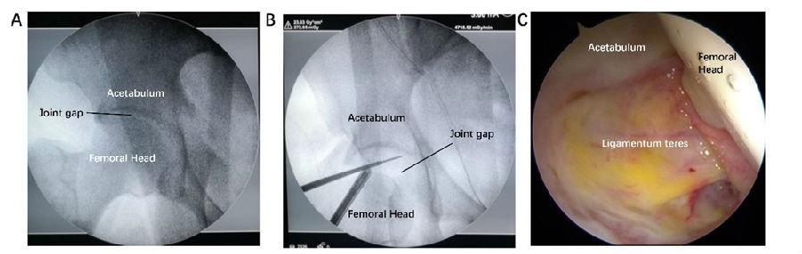 图8 患者仰卧位右髋 A.牵引前X片;B.牵引后X片;C.关节镜下关节间隙充分牵开,中央间室良好视野