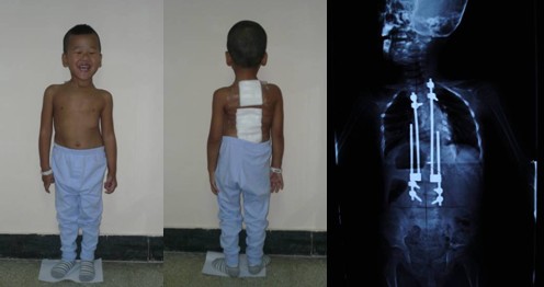 经过术前精心设计和准备后,2010年10月19日由赵宇副教授和王以朋副院长为患者实施了脊柱后路生长阀矫形内固定术(胸2椎体至腰4椎体)。手术顺利,术后未发生任何并发症,小幸保的脊柱畸形明显改善,术后测量侧弯角度由术前88°减小至50°,双肩接近平衡,身高也增加了7cm。在医护人员精心治疗护理下,小幸保术后10天顺利康复出院。