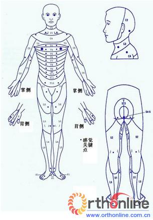 感觉检查的必查部分是检查身体左右侧各28个皮节的关键点(C2至S4-5)。关键点应为容易定位的骨性解剖标志点。每个关键点要检查2种感觉:轻触觉和针刺觉(锐/钝区分)。